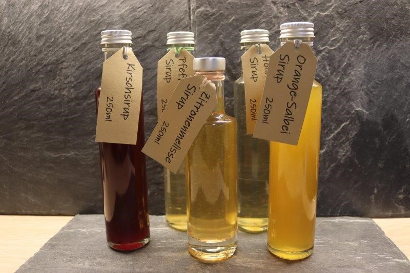 Sirupe von Kirsche, Zitronenmelisse, Holler, Pfefferminze, Orange-Salbei